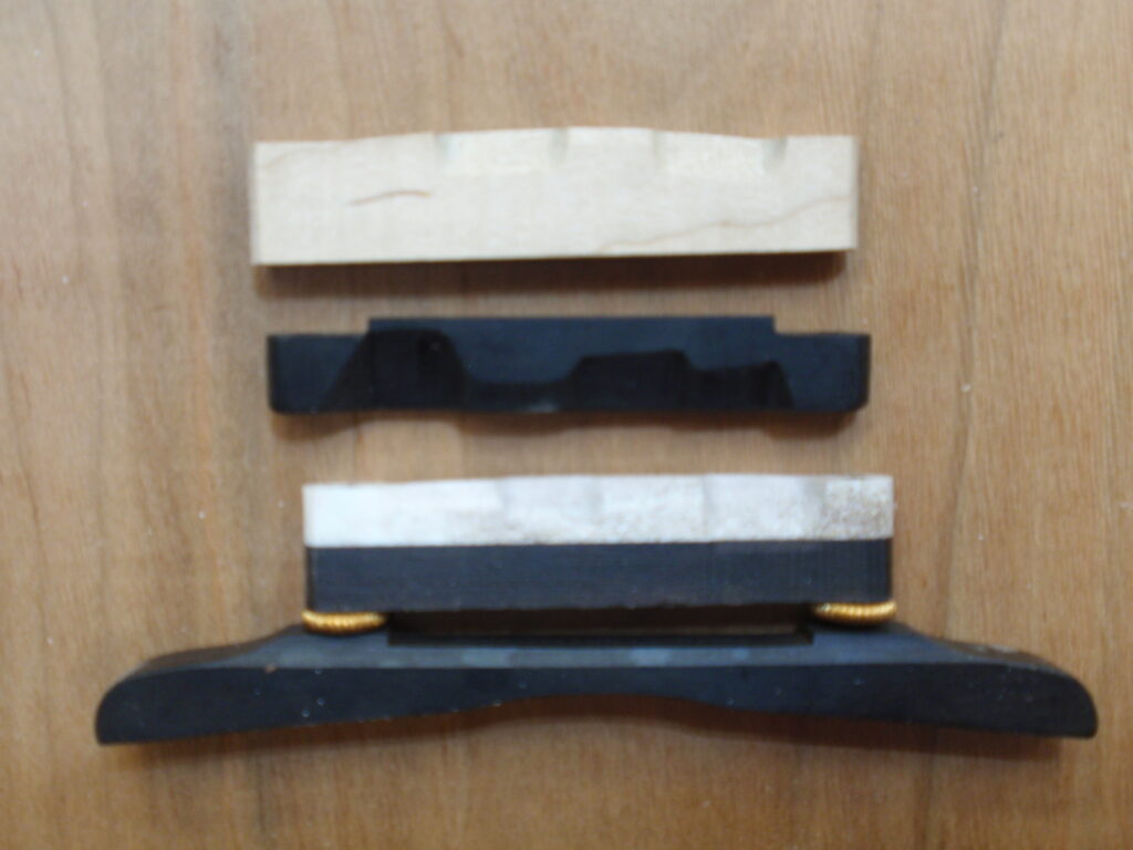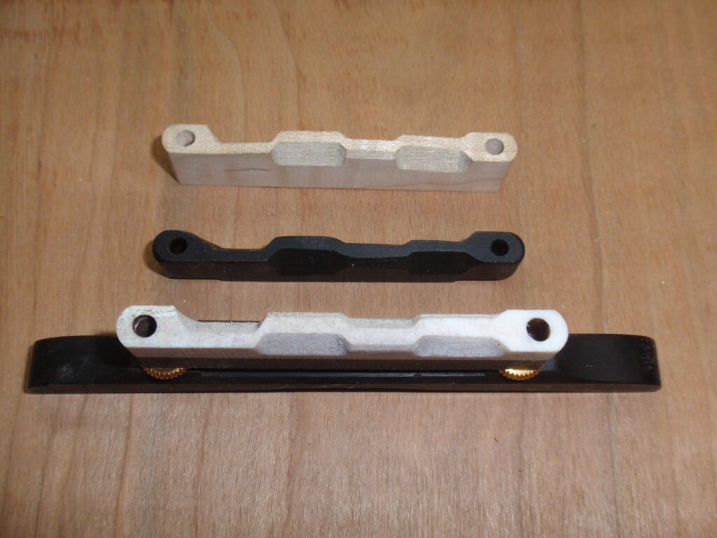 Another area I have been working on is making custom mandolin bridge saddles that fit on Cumberland Acoustic and Golden Gate bridge feet. I have machined different types of materials and saddle curvatures. The deer antler saddle shown below is epoxied to a piece of ebony before I machine the compensation. I have been using this saddle on one of my mandolins with good results. Let me know if you have an interest. My number is (970) 443-1954 or email me at durljones@gmail.com